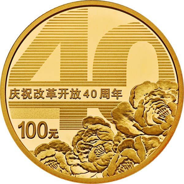 8克圆形金质纪念币背面图案为数字“40”造型与牡丹花组合设计,并刊“庆祝改革开放40周年”字样及面额。