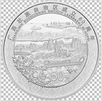 150克圆形银质纪念币背面图案为广西典型山水造型、高铁、港口及朱槿花,衬以壮锦纹样组合设计,并刊“广西壮族自治区成立60周年”汉、壮文字样及面额。