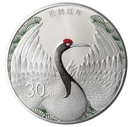 100克圆形银质纪念币背面图案为鹤与松枝等组合图案,并刊“松鹤延年”字样及面额。